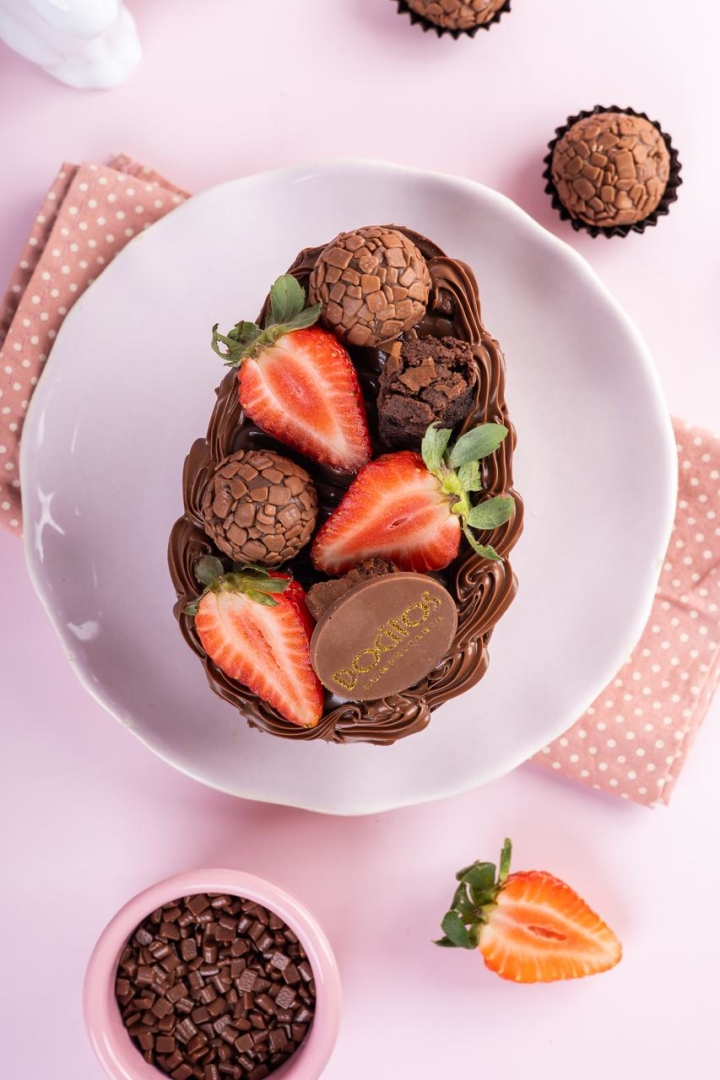 Casca de chocolate ao leite com camadas cremosas de brigadeiro de ninho e chocolate, morangos frescos, finalizado com nossos deliciosos brigadeiros e pedacinho de brownie.