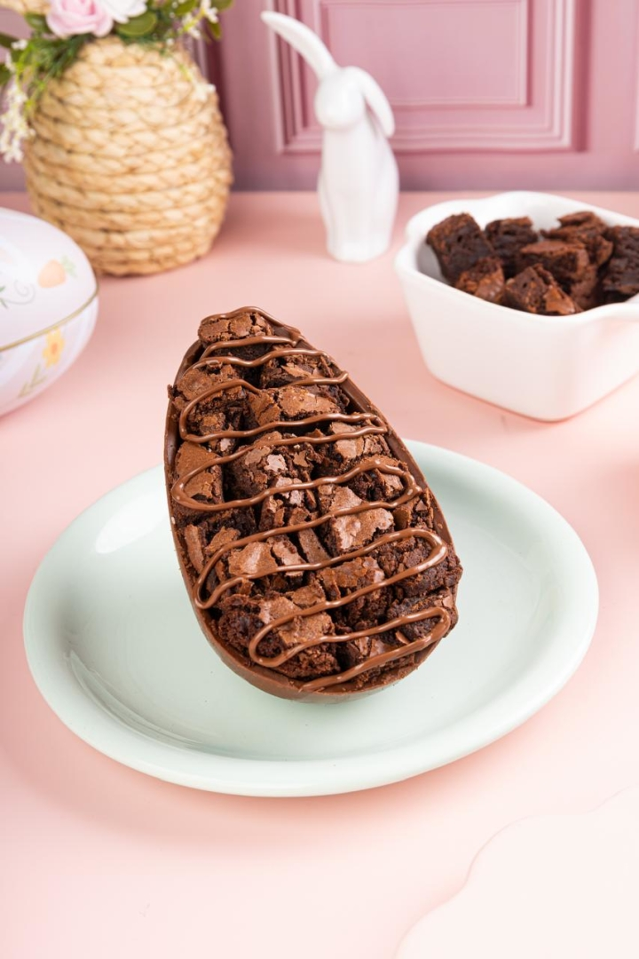 Casca ao leite, com recheio cremoso de creme meio amargo muito brownie e nutella pra finalizar. peso aprox: 380gr
