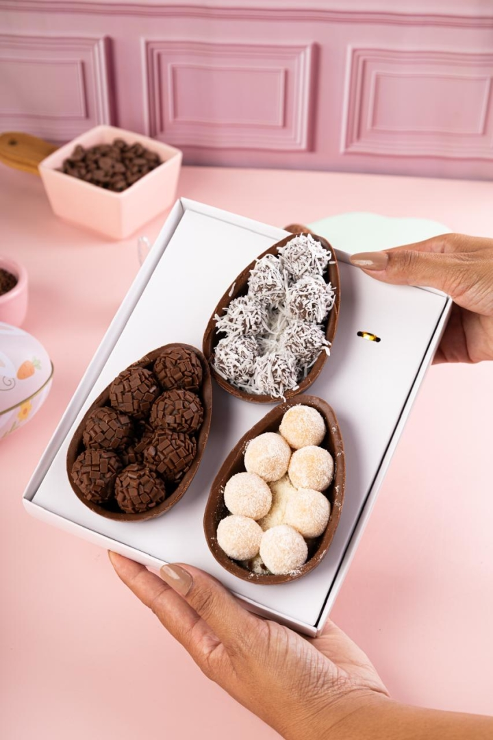 Um clássico de páscoa. trio de ovos 1 unidade sabor brigadeiro 1 unidade sabor leite ninho 1 unidade prestigio Peso aprox: 150gr cada